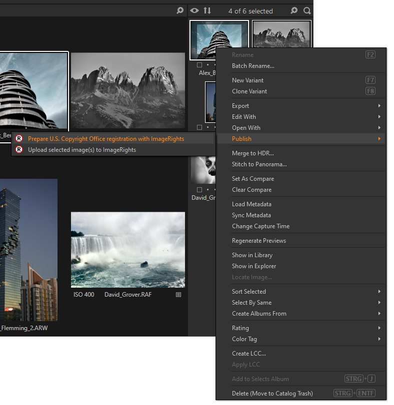Afterwards, you can right-click images inside Capture One and then choose ImageRights from the "Publish" dropdown. Our plugin will ask you for username and password and then upload your images into your ImageRights account. As you can see in the picture on the left, preparing a U. S. Copyright Office registration is then as easy, too.