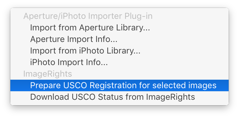 You probably already saw in the picture above, that our plugin also adds a "Download USCO Status from ImageRights" action to the File -> Plugin Extras menu. When you click that action, the plugin will download the current USCO Registration status for all images in every image set and smart image set from the ImageRights website into your Lightroom Catalog.
