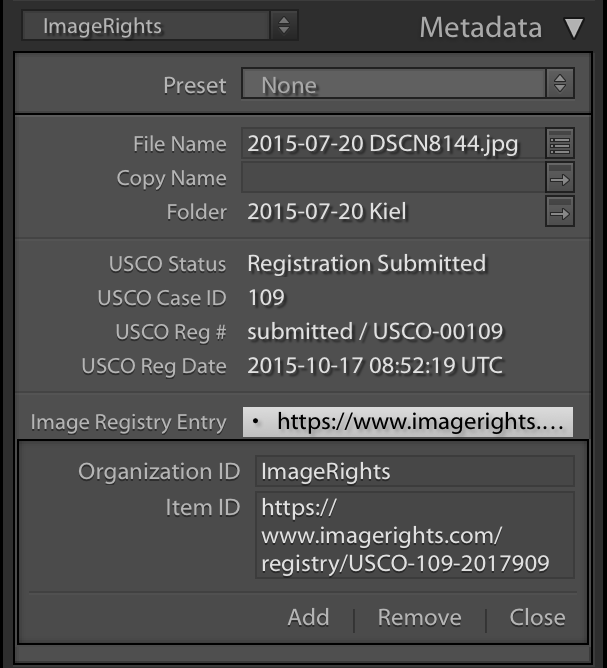 As you can see in the picture on the right, you can then select "ImageRights" in the dropdown box in the metadata panel to inspect the general registration status, the ImageRights-internal case ID and the registration number and date given by the U. S. Copyright Office.